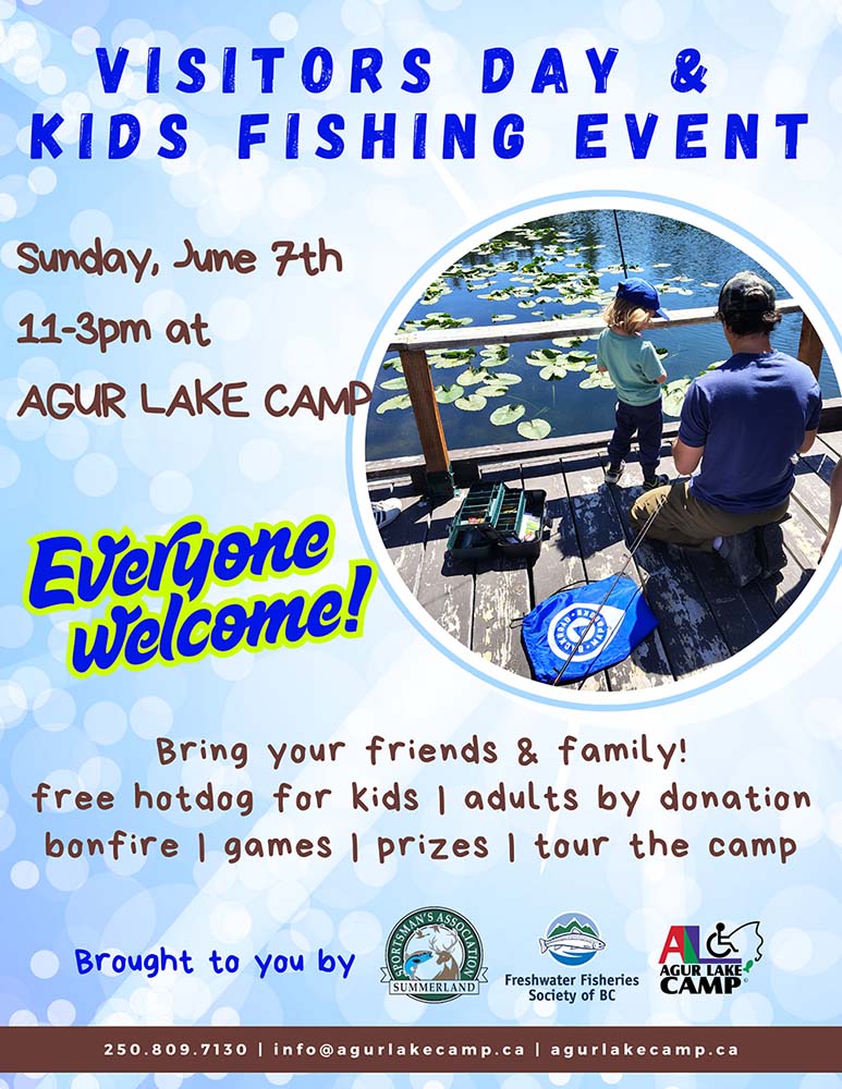 Join us for a fun day at Agur Lake Camp. The annual Visitors Day & Kids Fishing Event brought to you by Summerland Sportsman’s Association, Freshwater Fisheries Society of BC and Agur Lake Camp Society. Bring your friends and family to enjoy fishing, bonfire, games, prizes and more! Sunday, June 7th from 11-3pm. Everyone welcome!